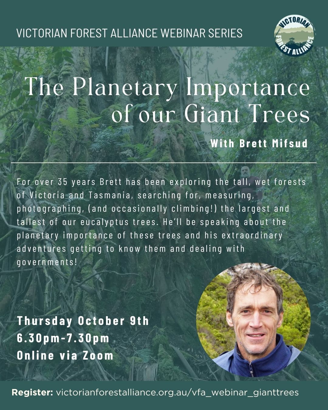 Brett will be speaking about the planetary importance of our giant trees in south eastern Australia and his extraordinary adventures getting to know them and dealing with Governments!